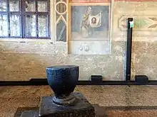 In the northeast corner of the hall is situated a particular tool: the "Pietra del Vituperio". It is a stool of black stone which was located at the middle of the hall in the Middle Ages and was used to publicly humiliate insolvent debtors, who were obliged to sit there as in the stocks.[3]