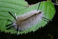 Caterpillars are covered with long setae, in tufts. They vary from yellowish and orange through dark gray. Extra long hair-pencils of white, black, and/or orange occur at both the front and rear of a caterpillar. Larval head capsules are bright orange. In the north, mature caterpillars are found from July to frost.[4] Caterpillars frequently rest on the upper surface of leaves, and though not gregarious, they are very conspicuous.[4] They grow to a length of 35 mm.
