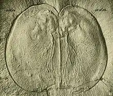 | Pakucaris | Arthropoda | Order | A hymenocarine that ranged in length from 11.65 to 26.6 millimetres (0.459 to 1.047 in). The main bivalved carapace covers around 80% of the body, with the pygidium covering the remaining 20%. | ![]() | ||