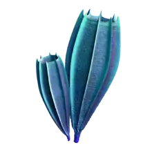 | Siphusauctum | Animalia | non-applicable | An enigmatic filter feeding animal. It lived by attaching itself to the substrate by a holdfast, it had a tulip-shaped body, called a calyx, into which it actively pumped water that entered through pores and filtered out and digested organic contents. It grew to a length of only about 20 cm (7.9 in). | ![]() | ||