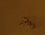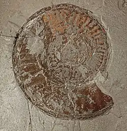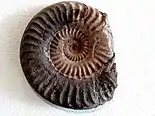 - Related to the Ammonite fauna, on Holzmaden there have been found several empty shells of this cephalopods, with associated crustaceans inside.[6] The original specimen was reported in 1995 and consisted on a possible member of the genus Paleastacus inside a chamber of a Harpoceras.[6] Other epizoans are found related to the decayed Ammonite shells, such as Serpulid Annelids and Bivalves, creating what was denominated as "benthic islands" as reference at be isolated benthic units that attracted fauna.[6] The Decapod is related to the family Erymidae, that are considered as possible bottom-dweller carnivorous or carrion feeders.[6] The associated fossil has several spherical structures that had been interpreted as decapod coprolites, implying that the animal lived for a long period on the shell, and maybe changes on the bottom oxygen stopped the process.[6] More recent studies had recovered new data about the inquilinism of decapods inside ammonites, this time, however, recovering three Eryonoidea lobsters together within a body chamber.[7] The lobsters most likely used the ammonoid as some kind of shelter, where was excluded the possibility of transportation into the body chamber by bottom currents.[7] There are several theories about the gregarious inquilinism showed by this specimens, such as that the shell was and ideal location to molt, as has not been proved to be corpses or molts; that the shell provided protection against predators; the decomposing soft body of the ammonoid was a source of food that attracted the decapods or that was used as a long-term shelter.[7] One key aspect found was that the muddy bottom was not suitable for burrowing, implying that the decapods look for a different shelter due to being unable to make their own.[7]