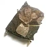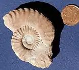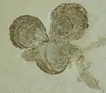 A benthonic Foraminiferan, member of Ceratobuliminidae inside the family Robertinida. It resembles a small ammonite. |