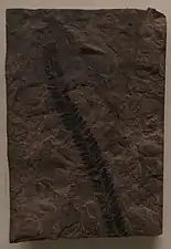 A Cyanobacteria, member of the family Oscillatoriales. The only difference compared to the Paleozoic forms is the much thinner cellular wall of the specimens described, which otherwise seems to be always thicker, and the more irregular shape of the individual tubes. Girvanella is almost rock-forming in the Lower and Upper levels, and is very common, but can only rarely be detected in the bituminous clay marl slate due to conservation reasons.[24] The Girvanella specimens recovered on the Posidonienschiefer can come from Diatomeas rather than Cyanobacteria, but its assignation is rather controversial.[24] | |