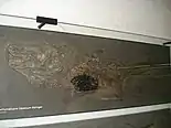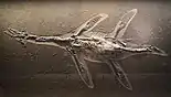 The Sachrang Formation or "Posidonienschiefer" Formation (Whose Vulgar name is "Posidonia Shale") is a geological formation of southwestern Germany, northern Switzerland, northwestern Austria, southeast Luxembourg and the Netherlands, that spans about 3 million years during the Early Jurassic period (early Toarcian stage). It is known for its detailed fossils, especially sea fauna, listed below.[1] Composed mostly by black shale, the formation is a Lagerstätte, where fossils show exceptional preservation (Including exquisite soft tissues), with a thickness that varies from about 1 m to about 40 m on the Rhine level, being on the main quarry at Holzmaden between 5 and 14 m.[1] Some of the preserved material has been transformed into fossil hydrocarbon Jet, specially wood remains, used for jewelry.[2] The exceptional preservation seen on the Posidonia Shale has been studied since the late 1800s, finding that a cocktail of chemical and environmental factors let to such an impressive conservation of the marine fauna.[2] The most common theory is the changes in the oxygen level, where the different anoxic events of the Toarcian left oxygen-depleted bottom waters, with the biota dying and falling to the bottom without any predator able to eat the dead bodies.[3]