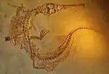 - SMNS 80234 (Stenopterygius quadriscissus) represents another female with embryos, yet also shows ribs broken perimortem that can be either of intraspecific aggression or a predation attempt. This specimen has several taxa associated: ammonite aptychi and two ophiuroids (Sinosura brodiei) and a articulated echinoid (Diademopsis crinifera), indicating a short-lived deadfall community.[8]