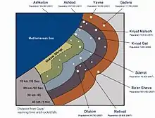 During the Gaza War, Palestinian militants began to deploy improved Qassam and factory-made rockets with a range of 40 kilometers.[78] Rockets reached major Israeli cities Ashdod,[79] Beersheba and Gedera for the first time, putting one-eighth of Israel's population in rocket range[80] and raising concerns about the safety of the Tel Aviv metropolitan area, Israel's largest population center,[81][82] as well as the Negev Nuclear Research Center.[83] According to Israeli authorities, 571 rockets and 205 mortar shells landed in Israel during the 22 days of the conflict.[24]