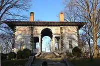 Proceeding north it runs alongside Riverview Park and the top of Holland Street[11] (a former carriage road and one of the few cobbled streets left in Hudson County) connecting to Paterson Plank Road. At 524 is the Van Vorst House a stone farmhouse built in 1742 by the family Van Vorst and considered to be the second oldest standing building in Hudson County.[12] At Congress Street the 9th Street-Congress Street Station of the Hudson Bergen Light Rail is one block to the east connected by an elevator to platforms at the base of the cliff.