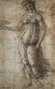 There are three drawings in Botticelli's style of Pallas, which may possibly be early ideas for the painting, though none are very close to the final figure, and all seem to be studies for a single standing figure. In two she carries a large olive branch and holds a helmet. They are in the Uffizi, the Ashmolean Museum in Oxford, and the Pinacoteca Ambrosiana in Milan.[17]
