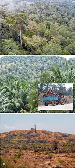 Forests have been cleared in parts of Indonesia and Malaysia to make space for oil-palm monoculture.[81] This has significant impacts on the local ecosystems leading to deforestation and biodiversity loss. For example, these processes have resulted in significant acreage losses of the natural habitat of the three surviving species of orangutan. One species in particular, the Sumatran orangutan, has been listed as critically endangered because of habitat loss due to palm oil cultivation.[82][54]
