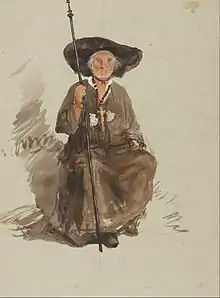 In the Middle Ages, a palmer (Latin: palmarius or palmerius) was a Christian pilgrim, normally from Western Europe, who had visited the holy places in Palestine and who, as a token of his visits to the Holy Land, brought back a palm leaf or a palm leaf folded into a cross. Palmers were often highly regarded as well-natured holy men because of their devotion to Christ along the pilgrimage. The word is frequently used as synonymous with "pilgrim".[1]