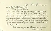 The Palmer Method of penmanship instruction was developed and promoted by Austin Palmer in the late 19th and early 20th centuries. It was largely created as a simplified style of the "Spencerian Method", which had been the major standardized system of handwriting since the 1840s.[1] The Palmer Method soon became the most popular handwriting system in the United States.[2]