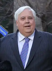 The United Australia Party (UAP), formerly known as Clive Palmer's United Australia Party and the Palmer United Party (PUP), is an Australian political party formed by mining magnate Clive Palmer in April 2013. The party was deregistered by the Australian Electoral Commission in 2017, revived and re-registered in 2018, and voluntarily deregistered in 2022 (but remains registered in Victoria).[9] The party fielded candidates in all 150 House of Representatives seats at the 2013 federal election. Palmer, the party's leader, was elected to the Division of Fairfax and it reached a peak of three senators following the rerun of the Western Australian senate election in 2014. When the party was revived under its original name in 2018, it was represented by ex-One Nation senator Brian Burston in the federal parliament.[10][11]