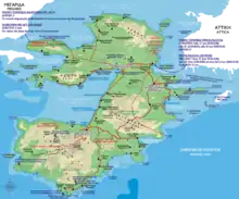 Salamis was probably first colonised by Aegina and later occupied by Megara, but became an Athenian possession in the time of Solon or Peisistratos, following the war between Athens and Megara around 600 BC.[6] According to Strabo, the ancient capital was at the south of the island; in classical times it was to the east, on the Kamatero Peninsula overlooking the Strait of Salamis; in modern times it is on the west.[7]
