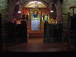The church was given back to Christian worship in 1912 upon the liberation of Thessaloniki in the Balkan wars, but from 1914 until 1916 it housed several Greek refugees from Thrace, and as a result it suffered some damage.[6] In order for it to be used as a Christian church again several modifications had to be done in order for the room to be conjoined and better lit. In specific, the western wall of the central and northern aisle had to be torn down, making the northern aisle a section of the portico, which thus became Π-shaped, as opposed to its previous Γ shape. The minaret was torn down and the mihrab was removed.[7] The western part of the portico was sealed with glass panes and new roof tiles were installed, brought from Villa Allatini.[8] The precinct and the propylon of the church were built in 1939.[8]