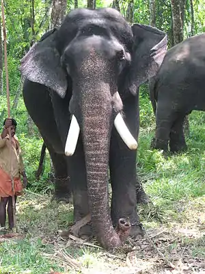 Pampady Rajan, who was born in Malayattoor Forest Division Kerala was bought in the 1970s by Moodankallungal Baby at an auction from Kodanad elephant training center for Rs 25,000.His early name at kodanad elephant training center was Bastin.Presently living at Pampady a village in Kottayam district Kerala.[2] Pampady Rajan has won many Gajapattams (elephant awards) including Gajarajan, Gajakesari, Gajarakthnam, Gajarajaprajapathi, Gajarajakulapathi, Gajaraja Lakshana Perumaal, GajarajaGajothama Thilakam, GajendraKarnan and a rare award called Gajamaanikyam for his beauty.[3] On 21 October 2015, Rajan was honoured with a new title "Saarvabhauman Gajaraja Gandarvan" by Mahanavami committee in Kodunthirapully Village, Palakkad.[4] He is the winner of 2006 and 2007 Ithithanam Elephant Fest which was held at Changanassery in Kottayam district. He has participated in many poorams including the most famous Thrissur pooram.[5] Pambady Rajan is one of the celebrity elephants in Kerala.[6] Since elephants are chosen to carry images of deities at temple festivals based on their stature and bearing, he was one of four elephants featured in life-size advertisements on the highway for a temple in Maradu.[7] Some disputes are there regarding the exact height of Rajan. In 2012, he was measured to be 308 cm (121 in).[8] [9].[10]