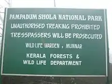 Pampadum Shola National Park is the smallest national park in Idukki district of Kerala in India. It is on the border with Dindigul district of Tamil Nadu.[1][2] The park is administered by the Kerala Department of Forests and Wildlife, Munnar Wildlife Division, together with the nearby Mathikettan Shola National Park, Eravikulam National Park, Anamudi Shola National Park, Chinnar Wildlife Sanctuary and the Kurinjimala Sanctuary.[3] The park adjoins the Allinagaram Reserved Forest within the proposed Palani Hills Wildlife Sanctuary and National Park.It is a part of Palani hills stretched up to Vandaravu peak. The Westerns Ghats, Anamalai Sub-Cluster, including these parks, is under consideration by the UNESCO World Heritage Committee for selection as a World Heritage Site.[4]