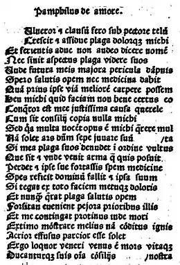 Pamphilus de amore (or, simply, Pamphilus or Pamfilus) is a 780-line, 12th-century Latin comedic play, probably composed in France, but possibly Spain.[1] It was "one of the most influential and important of the many pseudo-Ovidian productions concerning the 'arts of Love'" in medieval Europe,[2] and "the most famous and influential of the medieval elegiac comedies, especially in Spain".[1] The protagonists are Pamphilus and Galatea, with Pamphilus seeking to woo her through a procuress (as with the procuress in Book 1.8 of Ovid's Amores).[1]