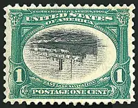 As part of the Pan-American Exposition held in Buffalo in 1901 the United States Post Office Department issued a series of six commemorative stamps. Each stamp featured an ornate colored frame enclosing a black-and-white image of some means of (or adjunct to) modern rapid transportation. In the standard American Scott catalog, these six stamps carry the numbers 294-299. The first day of issue for the stamps was May 1, 1901.[1]: 60–61