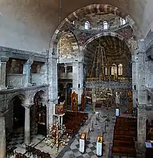 Panagia Ekatontapiliani (literally the church with 100 doors) or Panagia Katapoliani is a historic Byzantine church complex in Parikia town, on the island of Paros in Greece. The church complex contains a main chapel surrounded by two more chapels and a baptistery with a cruciform font.
