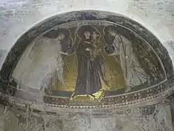 The mosaic of Panagia tis Angeloktisti is one of the best preserved early Christian wall mosaics of Cyprus and was likely created in the late 6th century. The period of Justin II saw the expanded production of wall and floor mosaics, and Cyprus was no exception. In Kiti, the Virgin Mary holds in her left arm the Christ Child, in the Hodegetria style, and stands on stool in a manner that makes her appear almost as if she were standing in mid-air.[3][6] On the Virgin’s right is the archangel Michael and on her left is the archangel Gabriel, and all are situated against a golden background. Both angels’ wings appear to be made from peacock feathers, which is a symbol of eternal life. The angels appear to hold a scepter and offer a globe with a cross at the apex, which symbolizes the offering of earthly domination to Christ and the Virgin.[3][6] Megaw notes that these features are repeated in the mosaic at Saint Catherine’s Monastery in the Sinai and help corroborate the sixth century dating of the mosaic.[3]