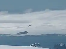Panagyurishte Nunatak (on the opposite coast of McFarlane Strait, in the background) from Melnik Peak, Livingston Island.