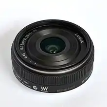 The Panasonic Lumix G 14mm f/2.5 lens is a pancake-style prime lens for Micro Four Thirds system cameras. In the Micro Four Thirds format, it is moderately wide. As of its late-2010 release, it is claimed by Panasonic to be the lightest interchangeable digital-camera lens. It is the prime-lens option available with the Panasonic GF2 and GF3, and available separately.