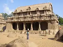 According to a plaque displayed at the site by the ASI, the Pallava dynasty had planned the structures as models of chariots in rock based on prototypes of ancient rathas built in wood.[9] The Pancha Rathas were carved during the reign of King Mahendravarman I and his son Narasimhavarman I. Work on these five rathas was discontinued following the death of Narasimha Varman in 668 AD.[5][10] The purpose of their construction is not known as the structures were not completed. Part of the collection within the Group of Monuments at Mahabalipuram, they were classified as a UNESCO World Heritage Site in 1984.[3]