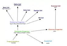 Endocrine progenitor cells develop from Pancreatic Progenitor cells under the influence of Ngn3 (neurogenin 3). This cell fate commitment is due to the expression of Sox9 (Sry-related HMB box transcription factor 9) and suppression of Notch signaling. Pancreatic Progenitor cells are hence Ngn3+/NeuroD+/IA1+/Isl1+/Pax6+ cells. These cells then develop into Beta cell pro-precursors under the influence of Pax4. Beta cell pro-precursors are MafB+/Pdx1+/Nkx2.2+ cells. These beta cell pro-precursors are determined to form beta cell precursors expressing Pax1.[23] Finally, beta-cell precursors mature into mature adult beta cells which are Pdx1+/Nkx2.2+/Nkx6.1+/Pax6+/NeuroD+/MafA+.[24]