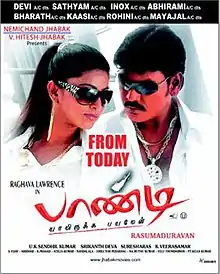 Pandi is a 2008 Indian Tamil-language masala film written and directed by Rasu Madhuravan. It stars Raghava Lawrence and Sneha, while Namitha, Nassar, Saranya Ponvannan, and Sriman play supporting roles. The film was released on 23 May 2008. It was a hit in B&C centres.[1] The film was also later dubbed into Hindi as Ek Dulara in 2011.