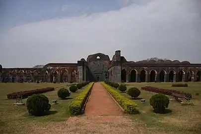 The capital of Bengal was shifted from Pandua to Gaur in 1450. The reasons for the shift are yet to be ascertained but a change in the course of a river has been speculated.[3] Pandua continued to host mints that produced silver taka for the duration of the sultanate period. It was an important administrative center. The mints were known as Shahr-i-Naw and Muzzafarabad.[6] Pandua's decline began with the conquest of Sher Shah Suri. Pandua became part of the wilderness. Earthquakes damaged its buildings during the 19th century. The high humidity and monsoon seasons of Bengal also caused much of its architecture to crumble. Nothing remains of the former royal palace except for traces in raised mounds.