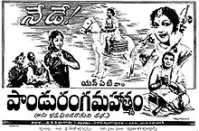 Panduranga Mahatyam (transl. The glory of Panduranga) is a 1957 Indian Telugu-language biographical film, based on the life of Pundarika, produced by N. Trivikrama Rao under the National Art Theatres banner and directed by Kamalakara Kameswara Rao. It stars N. T. Rama Rao, Anjali Devi and B. Saroja Devi (in her Telugu debut) with music composed by T. V. Raju. The film was dubbed into Tamil as Annaiyum Pithavum Munnari Dheivam (1959) and it was again remade as the Telugu film Pandurangadu (2008).