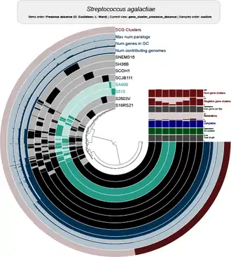 In 2020 Anvi'o[1] was available as a multiomics platform that contains pangenomic and metapangenomic analyses as well as visualization workflows. In Anvi'o, genomes are displayed in concentrical circles and each radius represents a gene family, allowing for comparison of more than 100 genomes in its interactive visualization. In 2020, a computational comparison of tools for extracting gene-based pangenomic contents (such as GET_HOMOLOGUES, PanDelos, Roary, and others) has been released.[67] Tools were compared from a methodological perspective, analyzing the causes that lead a given methodology to outperform other tools. The analysis was performed by taking into account different bacterial populations, which are synthetically generated by changing evolutionary parameters. Results show a differentiation of the performance of each tool that depends on the composition of the input genomes. Again in 2020, several tools introduced a graphical representation of the pangenomes showing the contiguity of genes (PPanGGOLiN,[46] Panaroo[65]).