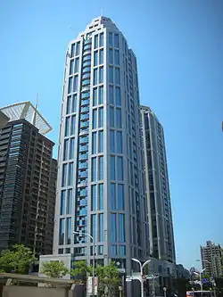 The Panhsin Twin Towers[2] (Chinese: 板信雙子星花園廣場; pinyin: Bǎnxìn Shuāng Zǐxīng Huāyuán Guǎngchǎng) is a skyscraper in Banqiao District, New Taipei, Taiwan. It is the sixth tallest building in Taiwan and the tallest in New Taipei City. The height of building is 180 m, the floor area is 100,670.03m2, and it comprises 34 floors (Tower A) and 32 floors (Tower B) above ground, as well as 7 basement levels.[1] Panhsin Twin Towers is the seat of headquarter of Bank Of Panshin (zh:板信商業銀行).