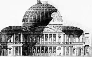 There is general agreement that the scheme of the great room, or rotunda, was derived from Santa Sophia in Istanbul.[1] The central space was contained in a square of 60 feet (18 m) topped by a coffered dome. On the east and west sides were superimposed colonnades of seven bays, screening the aisles and first floor galleries. At the north and south end there were short arms, 40 feet (12 m) wide, terminating in shallow segmental apses. The architectural elements and decorations were strictly Roman in inspiration. Below the rotunda there was a tea and supper room, of the same shape but divided into five aisles by the piers supporting the floor above.[2]