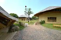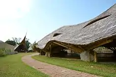 The school is an example for eco-friendly architecture and as such it has received both local as well as international recognition.[6] The buildings that make up the school fall into two categories. The classrooms and offices were built with load bearing walls made of rammed earth which carry bamboo roofs, cladding as well as structural elements. Due to the high thermal mass of rammed earth walls, temperature variations are moderated, thus eliminating the need for air conditioning. In addition, rammed earth walls keep humidity at specific levels which are ideal for asthma sufferers. The several open pavilions (which are called sala in Thai) that house the assembly hall, the Buddhist chapel, the school canteen, and a covered play area next to the swimming pool, are completely made out of bamboo, also using bamboo set on large boulders of natural stone for the structural supports. 24H Architecture from the Netherlands was responsible for the initial design.[7][8][9][10][11] with the construction and subsequent designs of additional buildings by Chiangmai Life Construction.