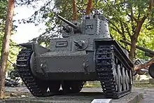 The two-man turret was centrally located, and housed the tank's main armament, a 37 mm Skoda A7 gun with 90 rounds of ammunition.[3] In addition, a 7.92 mm machine gun was in a ball mount to the right of the main gun.[3] This machine gun could be trained on targets independently of the main gun, or coupled to the main gun for use as a conventional coaxial machine gun.[3] The driver was in the front right of the hull, with the radio operator seated to the driver's left.[3] The radio operator manned the hull-mounted 7.92 mm machine gun in front in addition to operating the radio on his left.[3]