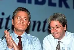 Gentiloni slowly abandoned far-left ideals, sharing more moderate views and becoming particularly involved in green politics and ecologism.[23] During those years he became a close friend of Chicco Testa who helped Gentiloni to become director of La Nuova Ecologia ("The New Ecology"), the official newspaper of Legambiente. As director of this ecologist newspaper he met the young leader of Federation of the Greens, Francesco Rutelli and became, along with Roberto Giachetti, Michele Anzaldi and Filippo Sensi, a member of the so-called "Rutelli boys", a group formed by Rutelli's closest advisors and supporters.[24]