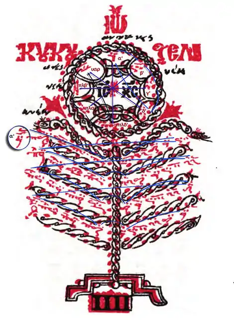 In the Papadike of the Codex Chrysander this circle can be found as a "crown" on the top of the Koukouzelian tree, and the four columns of tetraphonia were probably represented at the foot of the tree.[27] For an understanding of the phthongoi and the way of parallage between them it is necessary to discover an additional protos signature which is written left to the left upper branch of the tree: echos protos as starting and final pitch class (phthongos) of the ascending solfeggio (parallage) written in four rows shaped like a tree (its direction is indicated by blue arrows).