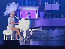 The song was performed by Gaga in a similar choreography at the thirty-fifth season of NBC's late night comedy show Saturday Night Live.[77] It was also present on the set list of Gaga's Monster Ball Tour (2009–2011). On the original version of the show, she wore multiple donned braided extensions and was perched atop a railing. From each of her braids, a dancer was attached on the stage. A backdrop of stars were shown during the performance.[78] During the revised Monster Ball shows, Gaga changed the concept and the performance of the song. She wore an emerald green dress by Thierry Mugler, and was attacked by a giant, mechanical Angler fish. Gaga then removed the dress to reveal a leotard of the same color and during the bridge she is lowered beneath the stage to acquire her pyro-technic bra. In the final chorus of the song Gaga returns and kills the monster with the sparks from the bra.[79] The song was part of the setlist of Gaga's 2012–2013 tour, the Born This Way Ball.[80] Gaga was notably absent from stage for the first two minutes of the song, and "Mother G.O.A.T.", a floating mechanical head performed it instead of her. Gaga then emerged on stage, and concluded the song while shooting the head, making it to cry blood.[81]