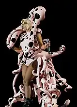 During the ArtRave: The Artpop Ball tour (2014), Gaga performed "Paparazzi" dressed up in a polka-dotted rubber outfit with tentacles growing out around her waist and her head. Rob Sheffield from Rolling Stone described her look as "she had an inflatable rubber order of fried calamari growing out of her spine",[82] while Adam Carlson from Billboard said that the outfit made Gaga look like a "dancing Ursula from The Little Mermaid ".[83] The song was added to the setlist of the Joanne World Tour (2017–2018), where she was wearing a red leather bodysuit and tassel leather boots, and the performance ended with a choreographed attack on Gaga by her dancers.[84][85]