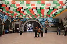 Papel picado ("perforated paper," "pecked paper") is a traditional Mexican decorative craft made by cutting elaborate designs into sheets of tissue paper.[1] Papel picado is considered a Mexican folk art. The designs are commonly cut from as many as 40-50 colored tissue papers stacked together and using a guide or template, a small mallet, and chisels, creating as many as fifty banners at a time.[2] Papel picado can also be made by folding tissue paper and using small, sharp scissors. Common themes include birds, floral designs, and skeletons. Papel picados are commonly displayed for both secular and religious occasions, such as Easter, Christmas, the Day of the Dead, as well as during weddings, quinceañeras, baptisms, and christenings. In Mexico, papel picados are often incorporated into the altars (ofrendas) during the Day of the Dead and are hung throughout the streets during holidays.[3] In the streets of Mexico, papel picados are often strung together to create a banner that can either be hung across alleyways or displayed in the home.
