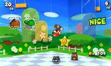 A major facet of Sticker Star's gameplay is the use of collectible stickers, which are used to gain abilities to progress through the game.[5] The player collects stickers that are found and peeled off from various areas in the environment.[5] Additionally, the player can purchase stickers using coins or receive them from non-playable characters (NPC).[6] The player has limited inventory space, with larger stickers taking up more room.[7] Stickers are used both in combat and for interacting with the environment.[8] The player can enter a state called "Paperization", which will lay the screen down flat to reveal additional secrets not visible regularly.[9] Real-world objects can be found, known in-game as "Things", such as baseball bats and scissors, that can be turned into special types of stickers called "Thing Stickers",[10] which are often needed to solve puzzles in the overworld.[8] For example, a Fan Thing Sticker can be placed in strategic areas in the environment and, when activated, creates wind that moves or destroys obstacles.[11]