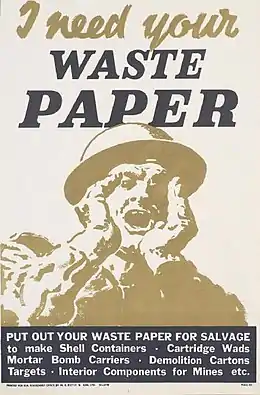 The compulsory recycling – or, as it was known, salvage – of paper in wartime and postwar Britain focused primarily on raising household collections. The scheme formed a key part of a wider National Salvage Campaign comparable to the American Salvage for Victory campaign. It was inextricably linked to military and economic concerns and drew upon the experience of the First World War when prices had been driven up by the disruption to imports.