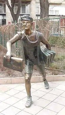 A paperboy is someone – often an older child or adolescent – who distributes printed newspapers to homes or offices on a regular route, usually by bicycle or automobile. In Western nations during the heyday of print newspapers during the early 20th century, this was often a young person's first job, perhaps undertaken before or after school. This contrasts with the newsboy or newspaper hawker, now extremely rare in Western nations, who would sell newspapers to passersby on the street, often with very vocal promotion. They were common when multiple daily papers in every city – as many as 50 in New York City alone – competed.