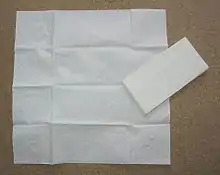 Table napkins can be made of tissue paper. These are made from one up to four plies and in a variety of qualities, sizes, folds, colours and patterns depending on intended use and prevailing fashions. The composition of raw materials varies a lot from deinked to chemical pulp depending on quality.