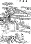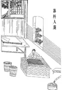 Woodcuts depicting the five seminal steps in ancient Chinese papermaking. From the 1637 Tiangong Kaiwu of the Ming dynasty.[14]