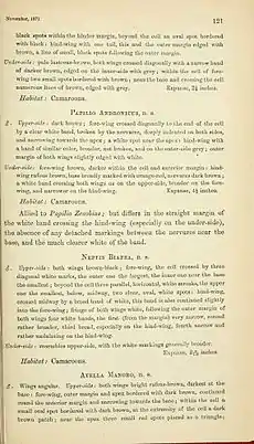 - Ward , C. 1871. Description of new species of African diurnal lepidoptera. Entomologist’s Monthly Magazine 8: 34-36; 58-60; 81-82; 118-122.