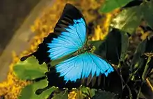 The Ulysses butterfly typically has a wingspan of about 14 cm (5.5 in), but depending on subspecies has some variations in size (western subspecies largest). The upperside of the wings are an iridescent electric blue; the underside is a more subdued black and brown. The colours are produced by the microscopic structure of the scales, a phenomenon called structural colouration.[2]