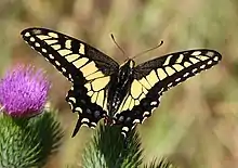 Papilio zelicaon, the anise swallowtail, is a common swallowtail butterfly of western North America. Both the upper and lower sides of its wings are black, but the upper wing has a broad yellow stripe across it, giving the butterfly an overall yellow appearance. There are striking blue spots on the rear edge of the rear wing, and the characteristic tails of the swallowtails. Its wingspan is 52–80 mm (2.04-3.15 inches). Its body is somewhat shorter than the rather similar western tiger swallowtail, with which its range overlaps; it also lacks the black stripes, converging toward the tail, of the latter. There is a somewhat darker subspecies, P. z. nitra, which is rare throughout the range, though somewhat more often found at lower elevations. [2] [3]