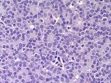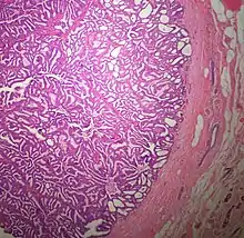 The microscopic histopathology of typical PDCIS lesions (refer to adjacent high-power photomicrograph) prepared with a hematoxylin and eosin stain consists of mammary ducts that have papillary fronds (i.e. thin, finger-like or leaf-like structures) lined with one or several layers of neoplastic, columnar-shaped epithelial cells (i.e. tall, narrow cells with their nuclei close to the site of their ductal attachment).[4] The fronds have branching fibrovascular cores. Epithelial cells lining the fronds' inner surfaces commonly form solid, cribriform (i.e. large nests of cells perforated by many rounded, variably sized spaces), or micro-papillary patterns. There may be a second population of epithelial cells lining the papillae that have abundant clear cytoplasm in addition to the usual neoplastic epithelial cells which line the papillae. These cells, which are not myoepithelial cells, have been termed globoid cells.[7] They have eosinophilic cytoplasm (i.e. pink or red cytoplasm due to its uptake of eosin stain).[6] PDCIS tumors with these cells have been termed dimorphic variants of PDCIS.[3] Myoepithelial cells are typically present at the periphery of the fronds but absent within the involved ducts.[4][7] The presence of a fibrous capsule and/or absence of peripherally located myoepithelial cells are strong indicators that the tumor is an ESP rather than a PDCIS.[3] PDCIS tissues may also contain areas of "Comedo-type necrosis", i.e. areas where dead cells have accumulated.[6]